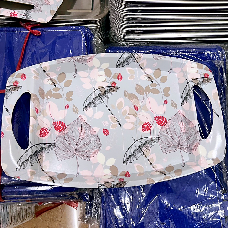 Mặt trên của khay là nhựa bóng họa tiết sang trọng. Mặt dưới của khay màu kem, nhám dẻo chống trượt.