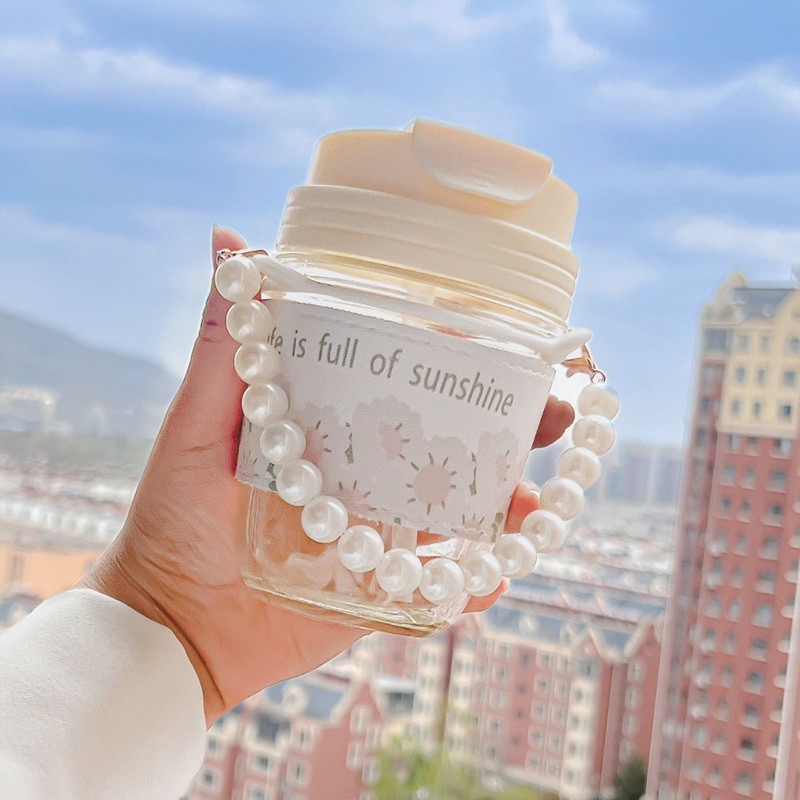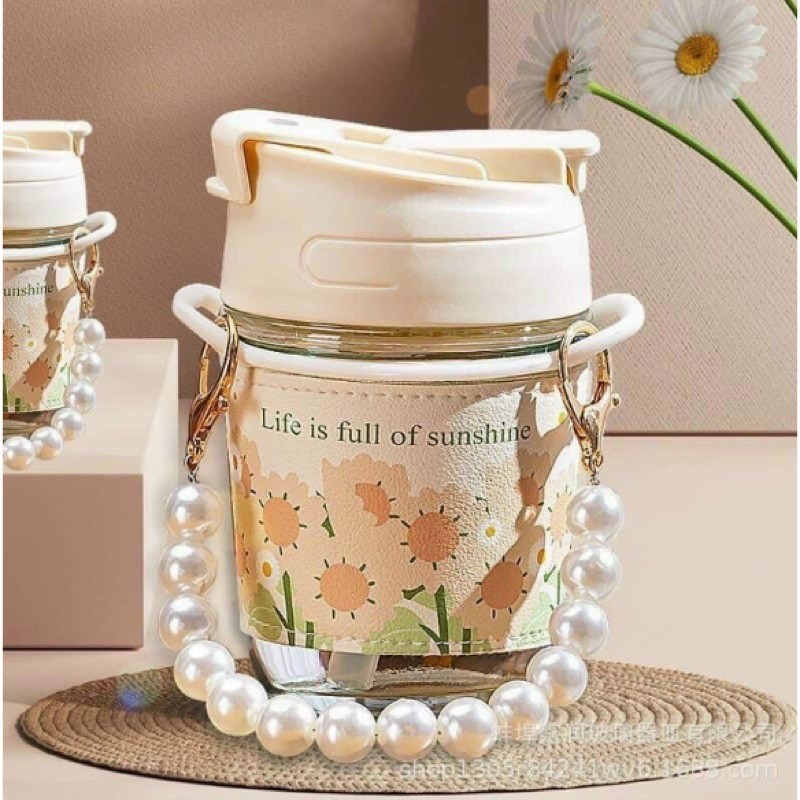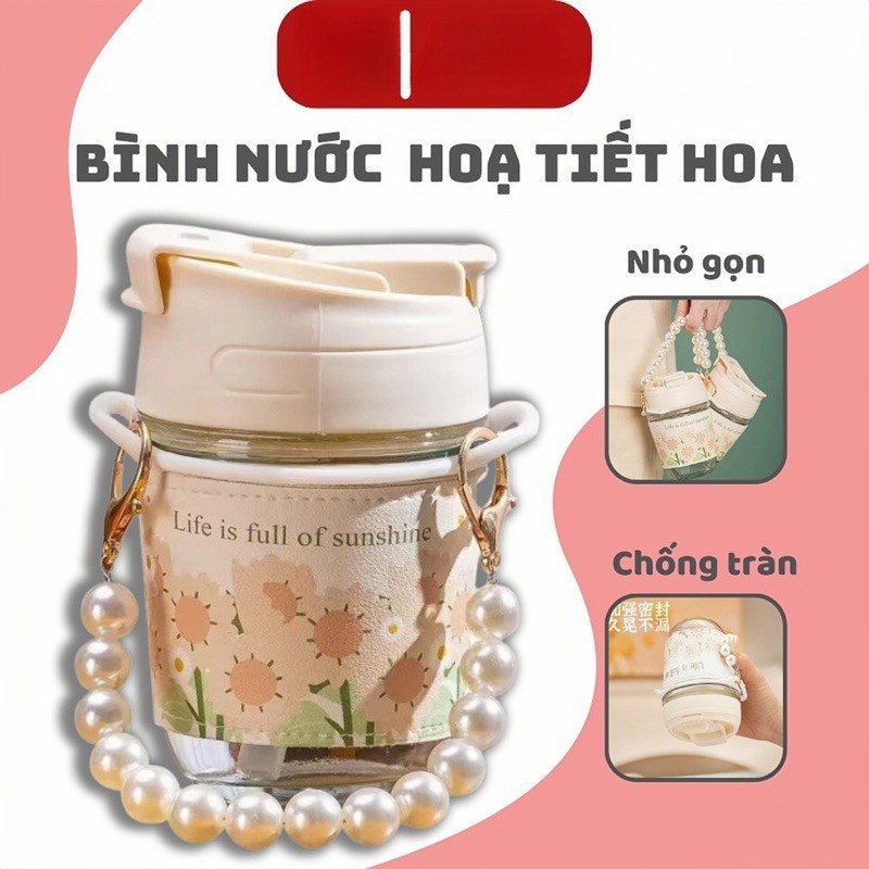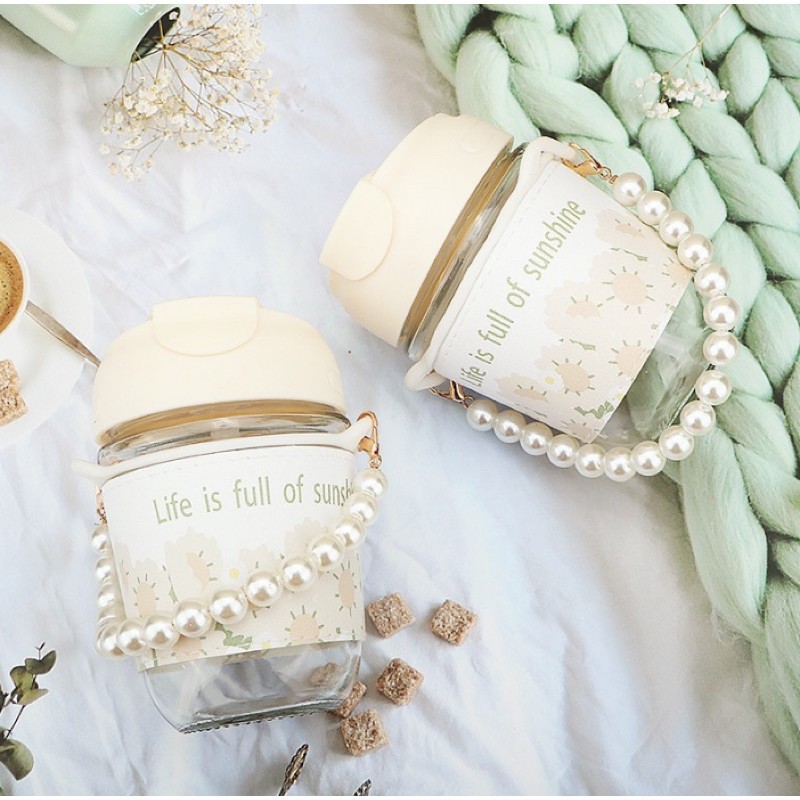 Bình Nước Thủy Tinh Họa Tiết Hoa cổ điển Chuỗi Ngọc Vỏ Bao Da Chống Nóng Kèm Ống Hút Silicon Dung Tích 350ml