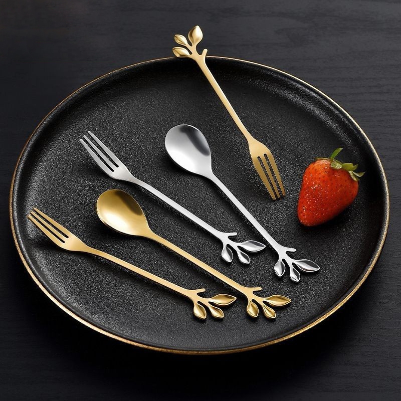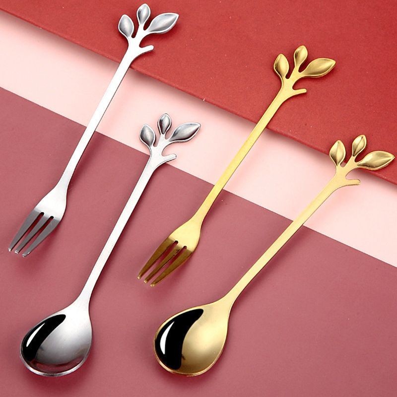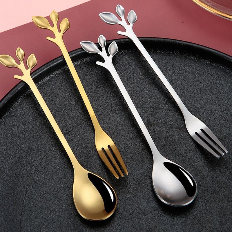 Thìa và nĩa inox mạ vàng bạc tay cầm HÌNH LÁ CÂY đẹp mắt 12.5×2.4cm