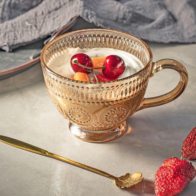 Cốc Thủy Tinh Uống Sữa cafe (G16) Màu Hổ Phách In Nổi Họa Tiết Hoa Hướng Dương Chịu Nhiệt Tiện Dụng