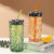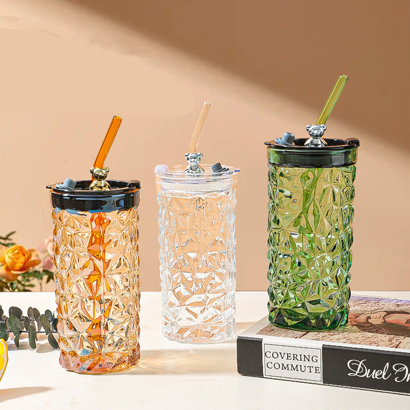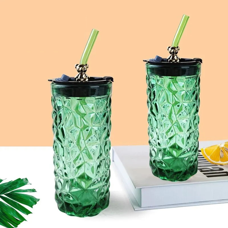 Cốc Uống Nước VÂN KIM CƯƠNG (G18) Có Nắp Đậy Và Ống Hút Hình Gấu Bằng Thủy Tinh
