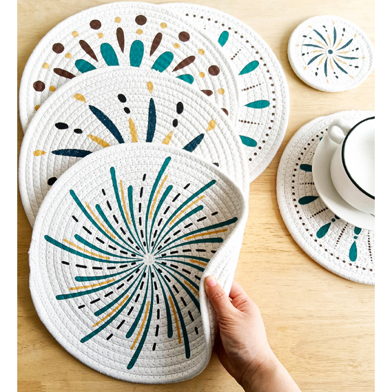 – Miếng lót với nhiều kích thước, màu sắc, vừa dùng lót ly, chén ngăn nước chảy xuống mặt bàn, chống nóng vừa trang trí cho bàn ăn, bàn trà.