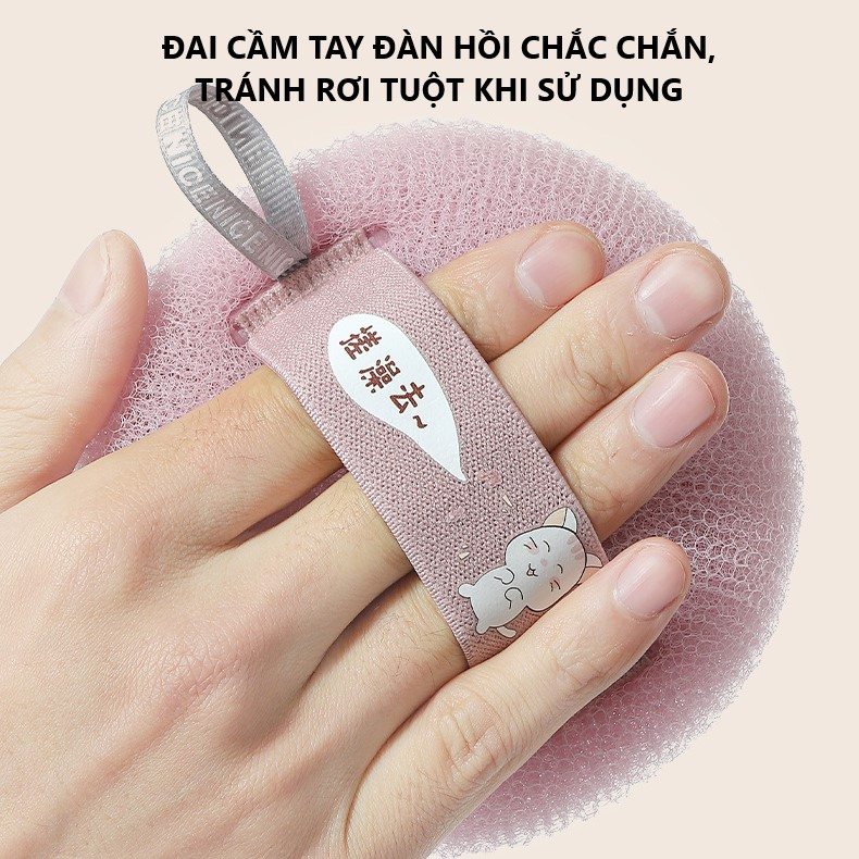 – Bông tắm có đai cầm tay chắc chắn, tránh rơi tuột, giúp bạn dễ dàng cọ rửa những vùng khó vệ sinh như vùng dưới cánh tay, cổ, gáy…