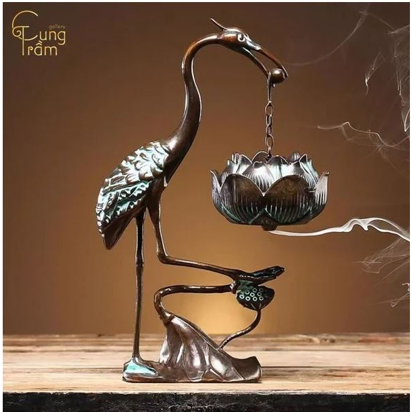 Hồng hạc đốt trầm hương chất liệu đồng dùng trang trí. Hạc đốt trầm hương bằng đồng. Lư đốt hương trầm hình hông hạc