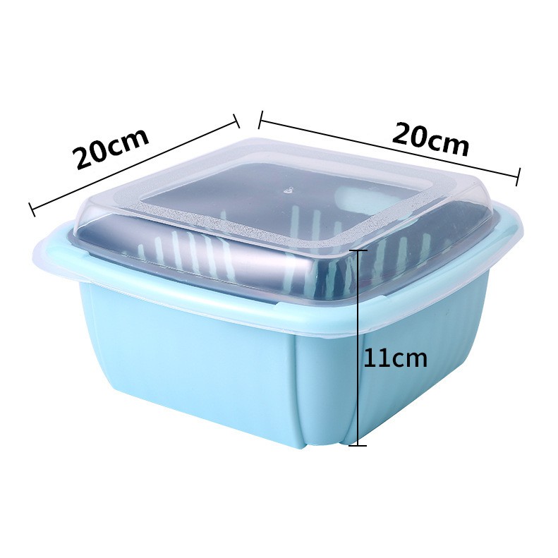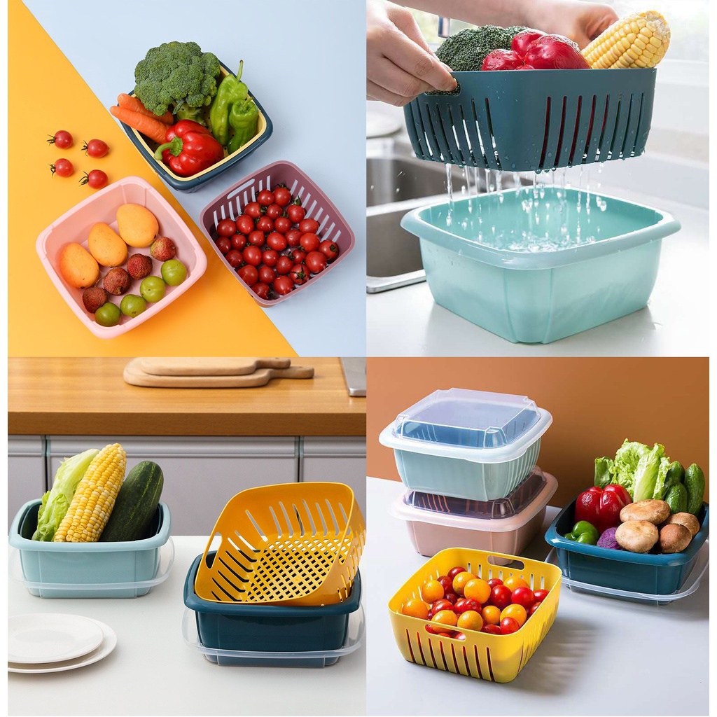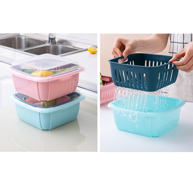 Hộp Rổ Đựng Rau Củ, Trái Cây Ráo Nước 2 Lớp Có Nắp Đậy 3 Trong 1 Đựng Đồ Đa Năng