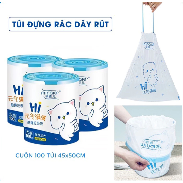 Cuộn 100 Túi đựng rác dây rút Minaier chống rò rỉ nước, không sợ bẩn tay, Túi đựng rác cuộn siêu dai