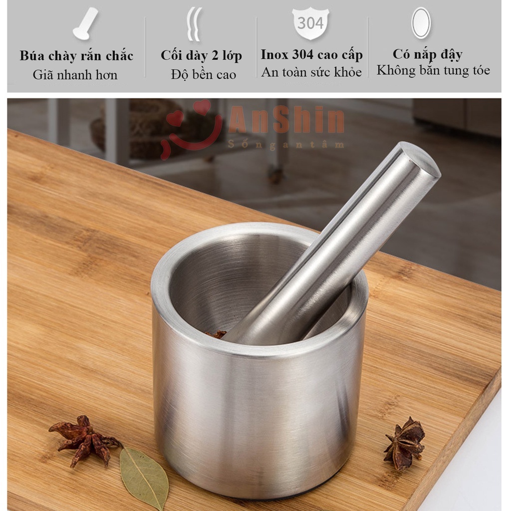 ✅Bộ cối chày Inox 304 cao cấp AnShin được đúc hoàn toàn bằng Inox 304 (là kim loại được ứng dụng rất nhiều trong công nghiệp thực phẩm và y tế) đáp ứng đầy đủ các tiêu chí: