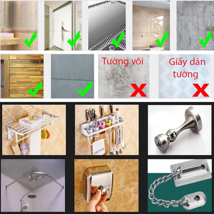 Công dụng: dùng để dán kệ inox, các thiết bị nhà bếp, phòng tắm bằng inox lên tường gỗ, gạch men, kính, kim loại mà không cần khoan tường