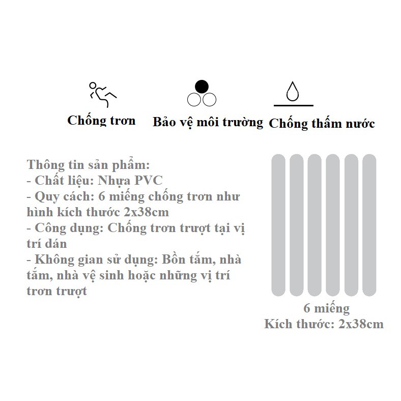 Công dụng: 6 miếng dán chống trơn trượt nhà tắm khi dán lên các bề mặt trơn trượt, dễ xảy ra trượt ngã sẽ tăng khả năng ma sát, giảm nguy cơ trơn trượt gây ra các tai nạn không đáng có cho người thân trong gia đình. Sản phẩm đặc biệt hữu ích với gia đình có người già, trẻ em, phụ nữ mang bầu.