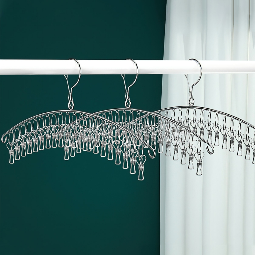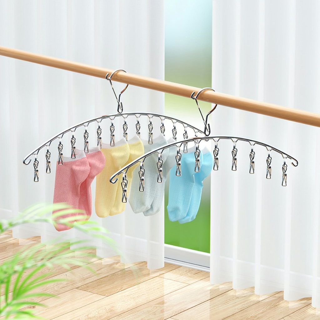 – Móc treo hình cánh cung với số lượng nhiều kẹp, giúp tiết kiệm diện tích và đảm bảo sạch sẽ khi phơi đồ cho bé, tất vớ, quần áo nhỏ…