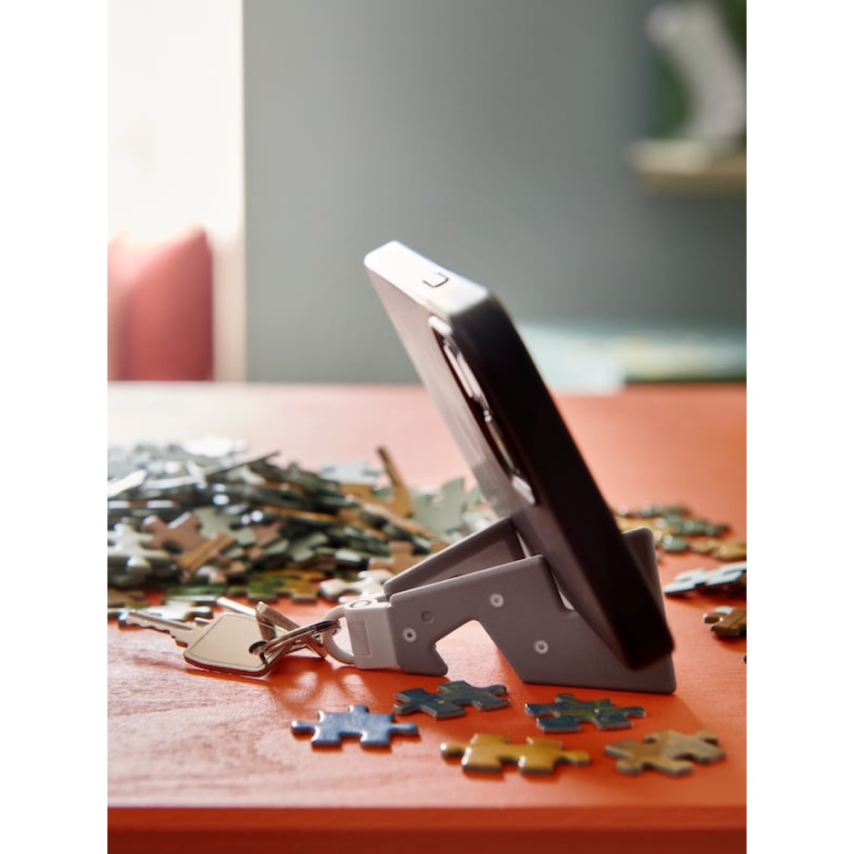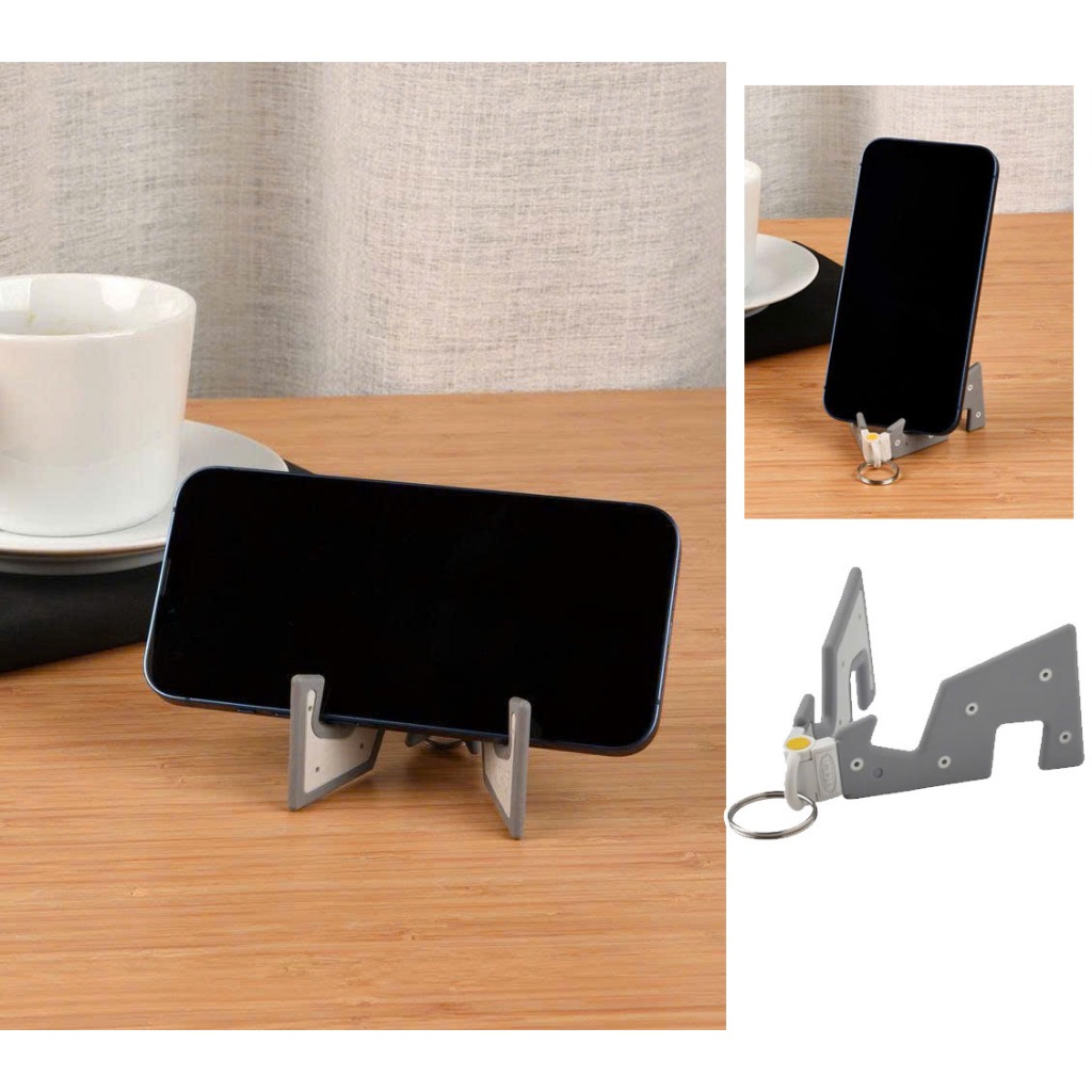 là một giá đỡ điện thoại và móc chìa khóa, dễ dàng và thiết thực để mang theo khi di chuyển vì nó có thể được gấp lại khi bạn không sử dụng.