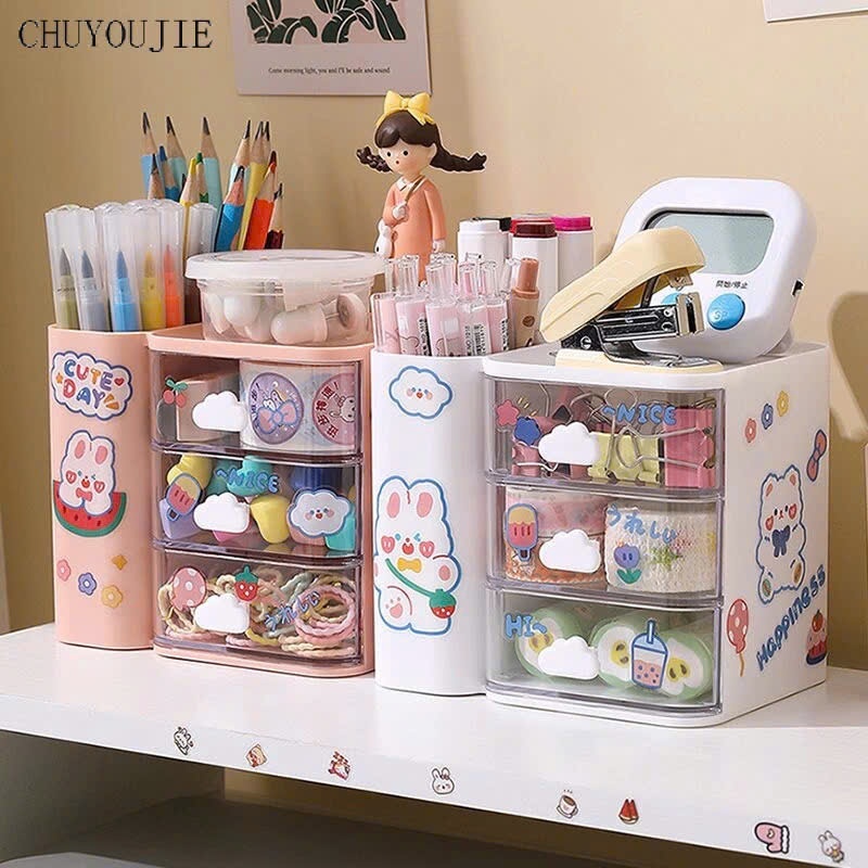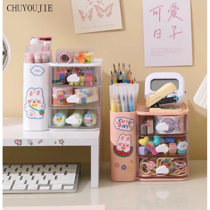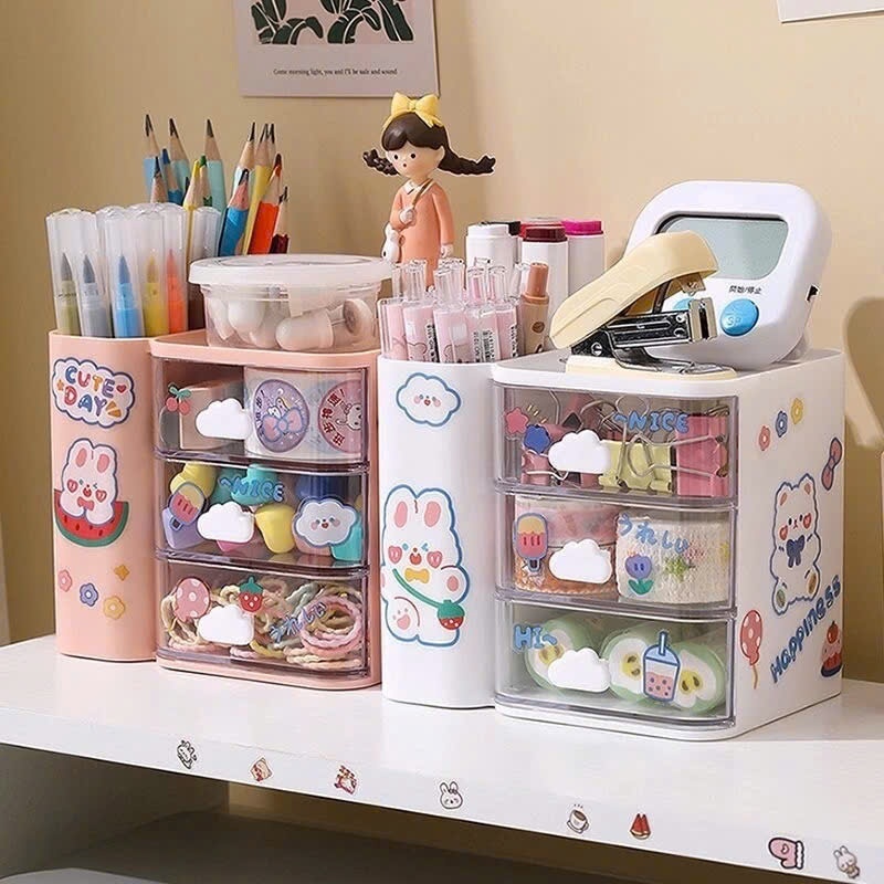 Hộp Đựng Bút Đồ Văn Phòng 3 Ngăn Kéo Dễ Thương K77 – Có Ngăn Cắm Bút, Trang Trí Cho Bàn Học (Không Sticker)