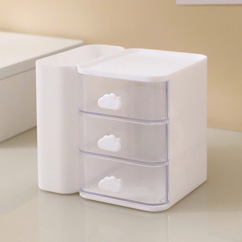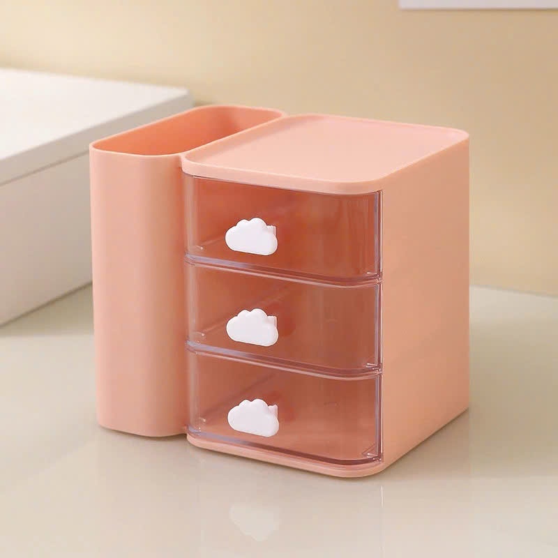 Thiết kế gồm 3 ngăn kéo nhỏ trong suốt, dễ dàng nhìn thấy đồ bên trong. Có thể đựng kẹp giấy, bút xóa, washi tape, dây buộc tóc, đồ trang điểm mini hoặc đồ thủ công nhỏ.